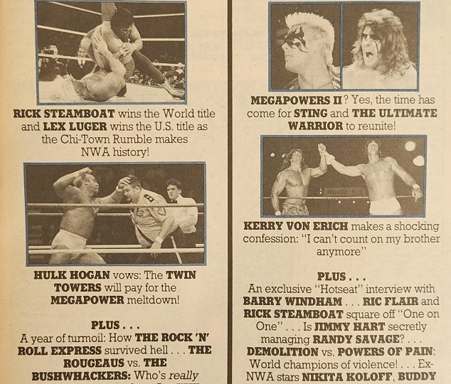 Next, the feature article about Ricky Steamboat, who says he’s not a real champion until he beats Luger & Sting. The real substance of the article is that Flair had lots of babyface challengers to wrestle, such as Sting, Luger, Rick Steiner, Ricky Morton, Dusty Rhodes, and Steamboat himself. Steamboat, by comparison, doesn’t have a ready list of capable heels ready, with only Flair, Mike Rotundo, and Barry Windham as serious challengers. (And Windham, the magazine speculates, might steer clear to let Flair have an unobstructed path.) Who else is there? The Iron Sheik? He’s past his prime. Butch Reed? C’mon. That’s why Steamboat, if he wants to prove himself to be a real champion, will need to wrestle guys like Sting and Luger. For his part, Steamboat says he’s not challenging them, but they’re welcome to have all the title shots they want. “I know I’m not a real champ until I beat them.” Sting and Luger say they’d like to wrestle for the title, but they don’t see the NWA setting the matches up. “Put it this way,” says Sting, “the promoters have this idea that the fans need somebody to root for and somebody to root against. They don’t understand that plenty of fans love to see great wrestling and can root for both men.” Flair, however, says he doesn’t see why Steamboat needs to wrestle those guys, insisting he’s the only challenger who matters. “I beat both Luger and Sting several times, so why should Steamboat wrestle inferior competition? They were never world champion, so they don’t fit into the equation.” Steamboat, however, says Sting and Luger are every bit as good as Flair, and he wants to take on all competitors.