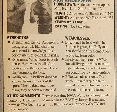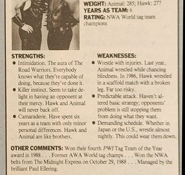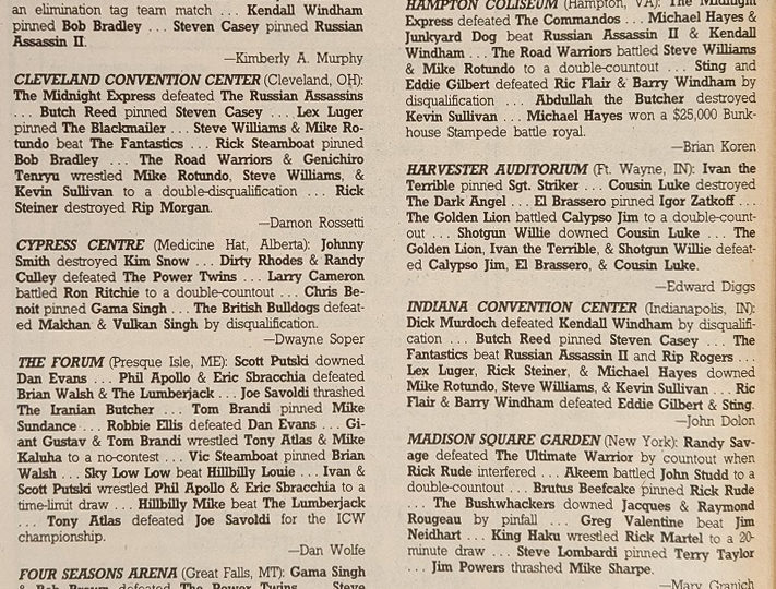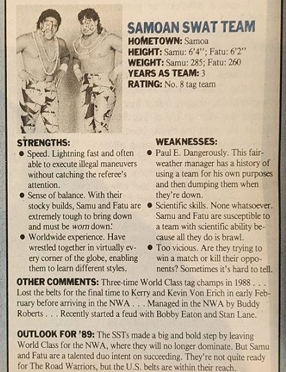 Then there’s Marty from Greensboro, who says the NWA is changing and not for the better. He misses the days of 1985 and 1986 when Dusty Rhodes and Ric Flair fought for the World title and Tully Blanchard and Magnum T.A. battled for the U.S. championship. Tony from New York, however, disagrees, saying the NWA is looking better than ever by opening its checkbook and signing stars like Dan Spivey, the Samoan Swat Team, and the Iron Sheik. He suggests the NWA continue to acquire talent, such as the Ultimate Warrior, the Rockers, and Sid Vicious.