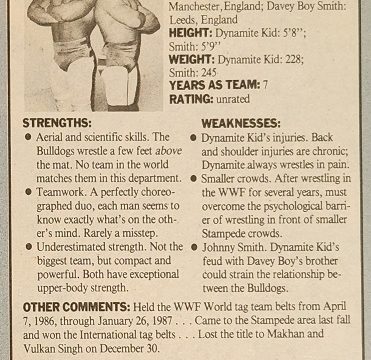 Next, it’s In Focus with Bob Smith. Normally, this column belongs to Craig Peters, but Craig has a new baby girl, Alexandra, who was born on March 7, so Bob’s filling in. He reports that Kenny “Sky” Walker of the New York Knicks, who won the 1989 slam-dunk championship during the NBA’s all-star weekend, is a big NWA fan. Kenny, who grew up in Georgia idolizing Dusty Rhodes, has joked that he might transition from the NBA to the NWA. “Of course,” he says, “I’d have to come up with some kind of awesome finishing move, like a clothesline where I’d go flying through the sky. Or maybe I’d jump off the top rope and call it the ‘Sky Hawk.’ I think I’d like that.”