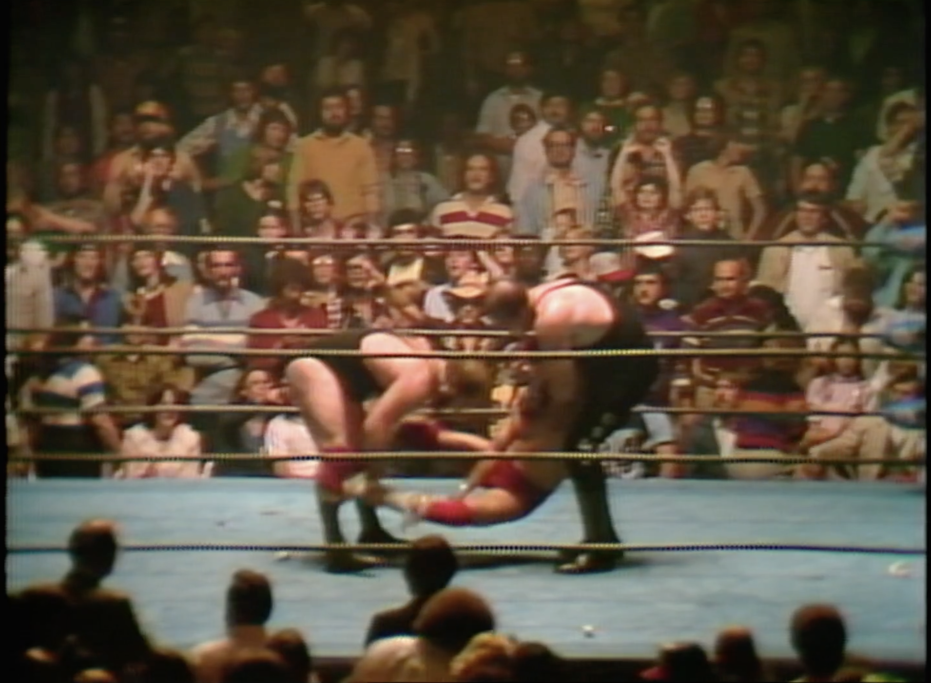 Ricky Steamboat joins us, and he’s got footage of a match with himself and Youngblood against Slaughter & Kernodle at a house show in Charlotte and man they’ve got some heat going on. Slaughter and Kernodle switching off to cheat behind the ref’s back has the crowd ENRAGED. Steamboat takes an absolute shit-kicking on the heel side but fights back with a suplex on Kernodle and it’s HOT TAG Jay Youngblood. Slaughter takes his great bumps in the corner off that and they hit the slingshot splash for the apparent pin…but Sarge has his feet on the ropes and Tommy Young couldn’t stop the momentum of his count. So Kernodle bumps the ref and the champs double-team Youngblood and destroy him, setting up a Doomsday Device version of the Slaughter Cannon! Sarge with the Cobra clutch, and at this point Kernodle just tosses the ref out and it’s CENSORED because it’s so violent! They literally put up a red screen with CENSORED in the middle. Awesome. So Steamboat has to carry his fallen partner out to save him and the heels escape with the titles. THIS WAS FUCKING AMAZING. No wonder they drew so much money with the blowoff.