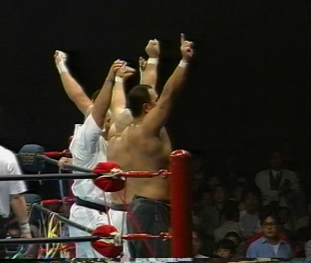 I know Aoyagi for being the guy Onita messed with to start FMW and I love his work as a moody karate guy. He’s part of the heel Heisei Ishingun stable, which I wouldn’t have thought made sense if you’re there representing NJPW but he shakes hands with Orihara to start so I’m guessing that isn’t important right now. (edit from the future: after watching their match against Riki Choshu’s crew later on, I think it’s fair to say they “heel stable” doesn’t fit here).